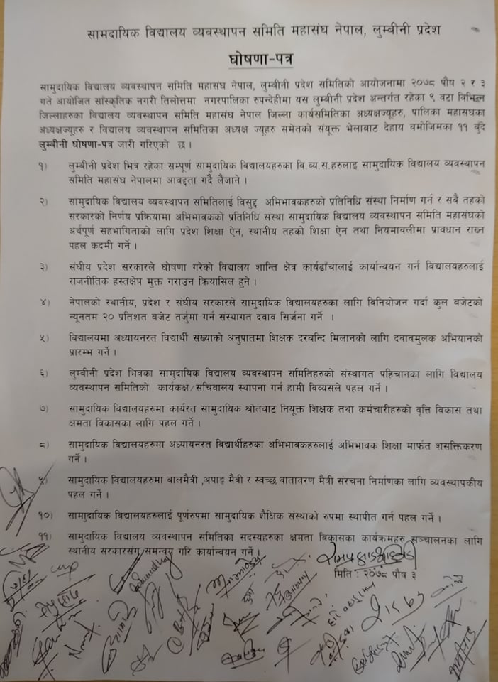 बुटवल , ३ पौष । सामुदायिक विद्यालय ब्यवस्थापन समिति महासंघ लुम्बिनी प्रदेशले ११ बुँदे घोषणा पत्र जारी गरेको छ । महासंघ लुम्बिनीको ९ जिल्लाका सामुदायिक विद्यालय ब्यवस्थापन समितिका अध्यक्ष तथा प्रतिनिधिहरुको रुपन्देहीमा २ दिन सञ्चालन भएको गोष्ठीले ११ बुँदे घोषणा पत्र जारी गरेको हो । सामुदायिक विद्यालयको शिक्षाको गुणस्तर तथा भौतिक सुधारको पक्षमा छलफल गर्दै घोषणा पत्र जारी गरिएको सामुदायिक विद्यालय ब्यवस्थान समिति महासंघ लुम्बिनीका अध्यक्ष अध्यक्ष सरद भट्टराईले जानकारी दिए ।