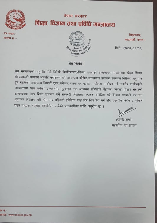 काठमाडौँ– विदेशी विश्वविद्यालयबाट सम्बन्धन प्राप्त शिक्षण संस्थाको अनुगमन गरी प्रतिवेदन बुझाउन शिक्षा विज्ञान तथा प्रविधि मन्त्रालयले पाँच सदस्यीय विषेश उपसमिति गठन गरेको छ ।