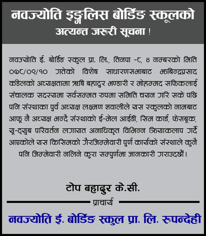 यही पुस १० गते बसेको विद्यालय सञ्चालक समितिको विशेष साधारणसभाले झविन्द्रप्रसाद (जेपी) कंडेललाई अध्यक्ष तथा ऋषिबहादुर भण्डारी र मोहम्मद सफिकलाई सर्वसम्मतरुपमा सञ्चालक समिति सदस्य चयन गरेको थियो । तर त्यसपछि पनि पुर्व अध्यक्ष ज्ञवालीले आफू नै विद्यालयको अध्यक्ष भन्दै इमेल आईडी,सिमकार्ड,फेसबुक र युट्युब परिवर्तन गर्ने लगायतका अनधिकृत क्रियाकलापहरु गरेको भन्दै विद्यालयले त्यस्ता गैरजिम्मेवार कार्यको संस्थाले जिम्मा नलिने स्पष्ट पारेको हो ।