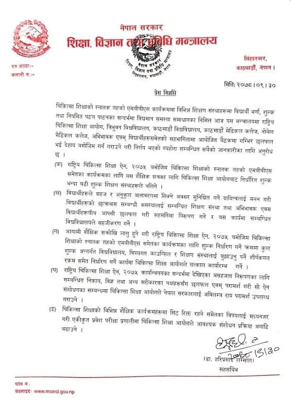 चिकित्सा शिक्षा आयोग, मेडिकल कलेज सञ्चालक, विद्यार्थी र अभिभावकसहितको बैठकले पाँच बुँदे सहमति गरेको हो । चिकित्सा शिक्षा आयोगले तोकेभन्दा बढी शुल्क लिन नपाउनेसहित ५ वटा सहमति भएका छन्।तर सो सहमतिमा केएमसी तथा नोबेलका संचालक सुनील शर्माले भने फरक मत राखेका छन्। उनले चिकित्सा शिक्षा ऐनले व्ववस्था गरे अनुसार वैज्ञानिक ढंगले शुल्क निर्धारण नभएको भन्दै सहमतिप्रति फरक मत राखेका हुन्।