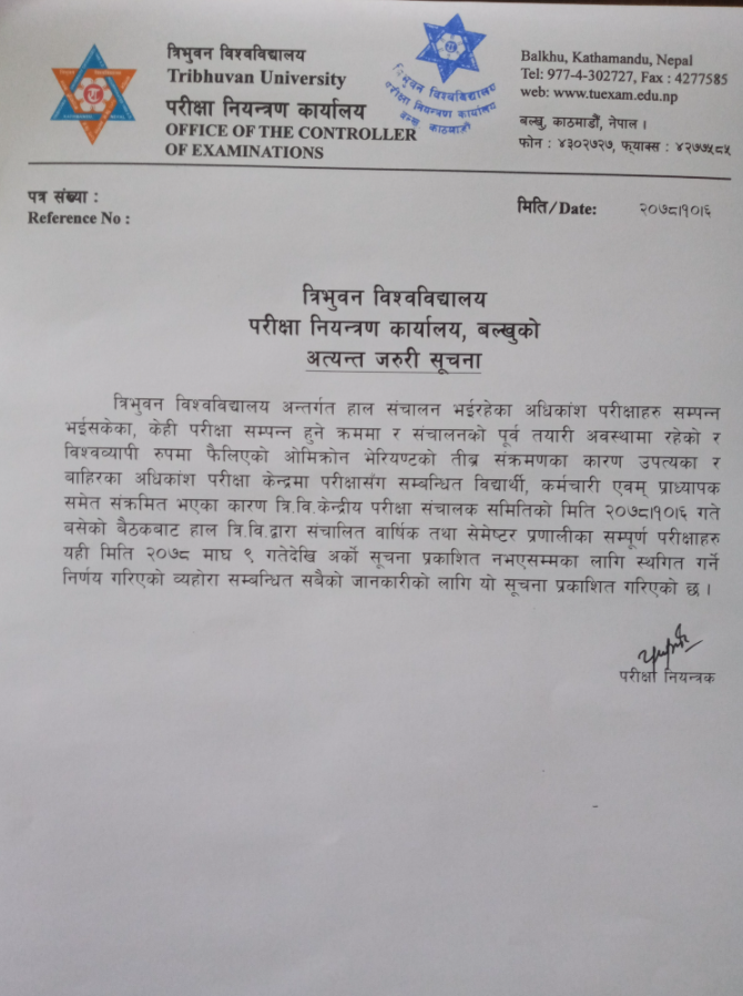 त्रिभुवन विश्वविद्यालय परीक्षा नियन्त्रण कार्यालयले एक सूचना निकालेर माघ ९ गतेदेखिका सबै परीक्षा अर्को सूचना नआएसम्मका लागि स्थगित गरेको जानकारी गराएको हो । आज बसेको बैठकले कोरोना संक्रमणको बढ्दो जोखिमको कारण विश्वविद्यालयका सबै परीक्षा स्थगित गर्ने निर्णय गरेको सूचनामा उल्लेख छ ।
